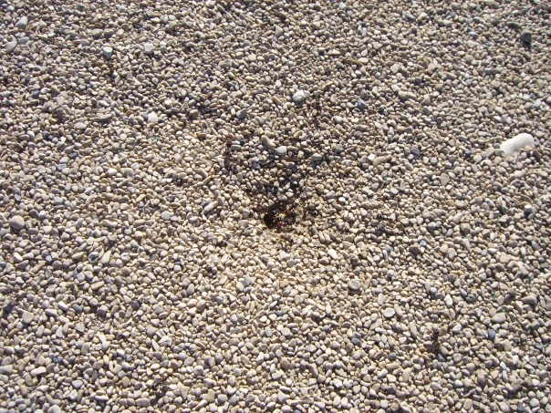 The light gray gravel is primarily medium to small size with trace of larger pebbles and small concave depression.