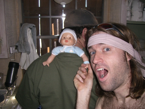 The lazy slacker is posing next to a man with a doll in the back of his green shirt.