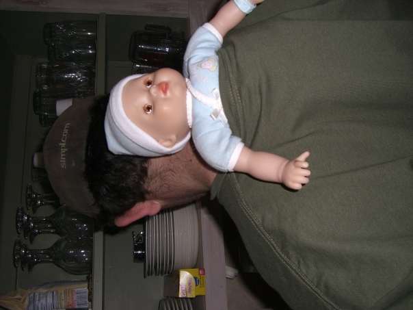A man, bizarrely, has a baby doll sticking out of the top of the back of his shirt.