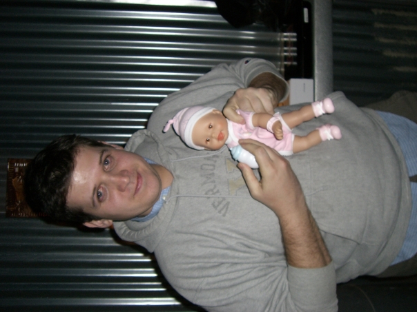 a young man in a grey sweatshirt holding a toy doll and bottle