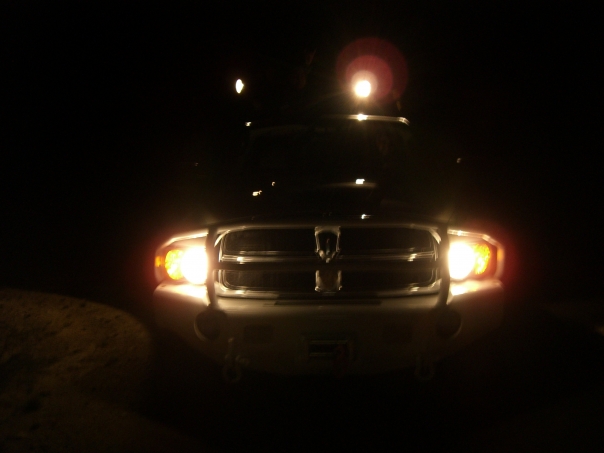 It is the front of the car with it's headlights turned on bright in otherwise dark surroundings.