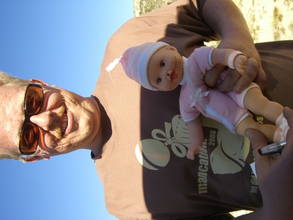 A middle aged adult male hold a baby doll in pink clothing