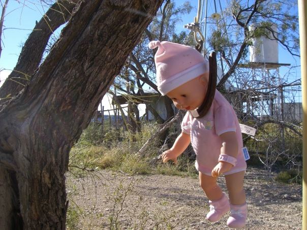 There is a baby doll with pink clothes hanging from a horseshoe that is tied in a tree.