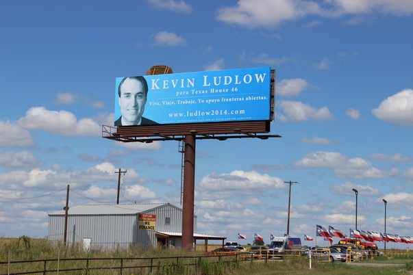 Under a blue sky, a big billboard advertises Kevin Ludlow's campaign for political office in Texas.