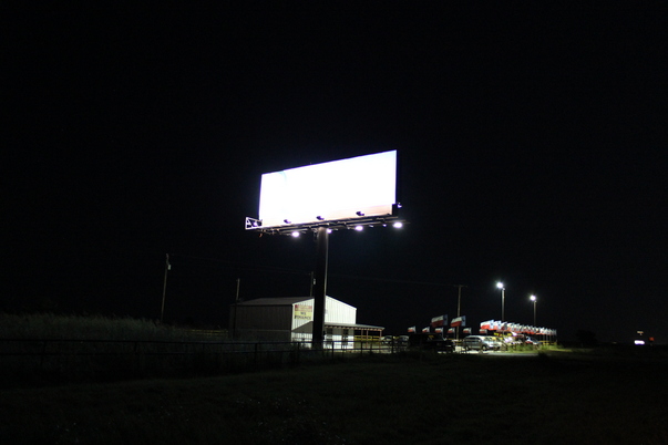 A blank lighted billboard stands above a used car lot.