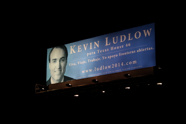 Kevin Ludlow billboard lit up at night and in Spanish.