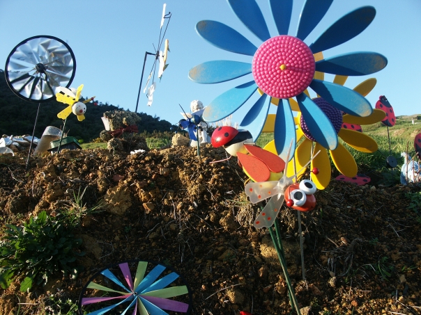 The colorful pinwheels decorated the yard and spun with the light breeze.