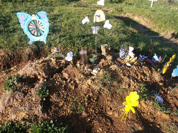 This seems to be some type of grave with pinwheels on it. There is also a glass of what appears to be tea in it.