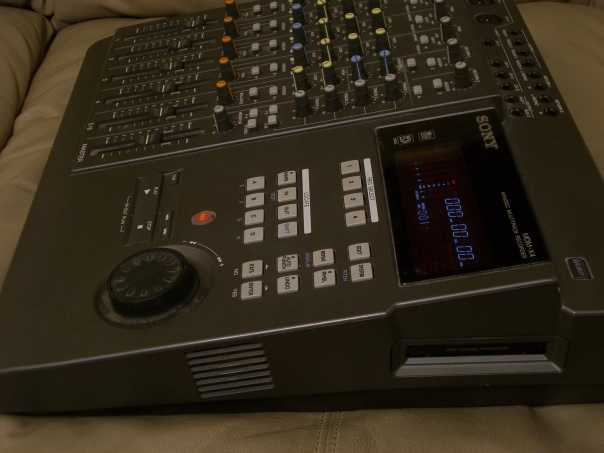 A small old seven channel sound board or mixer that is on.