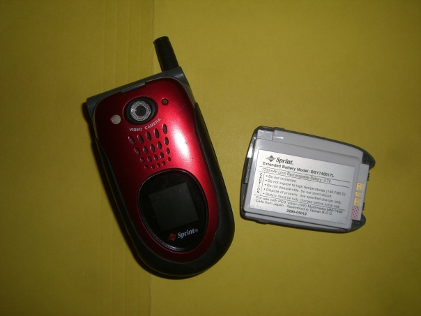 A red flip camera phone with its battery sitting beside it.