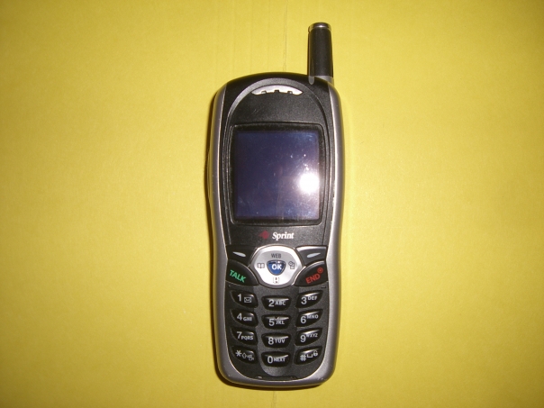 A really old black cell phone that looks like it came from the sprint store.