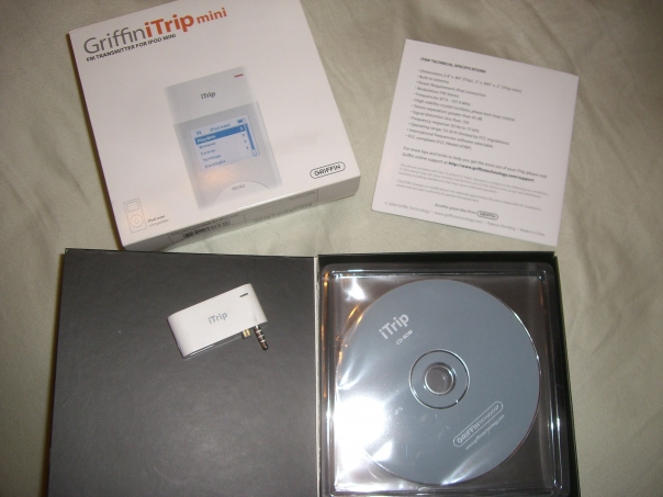 GriffiniTrip mini box opened and showcasing its contents: CD with transmitter for iPod mini and instruction pamphlet.