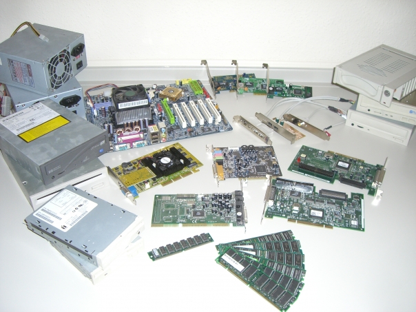 An assortment of computer components including drives, memory, a motherboard, power supplies, and various paraphernalia.