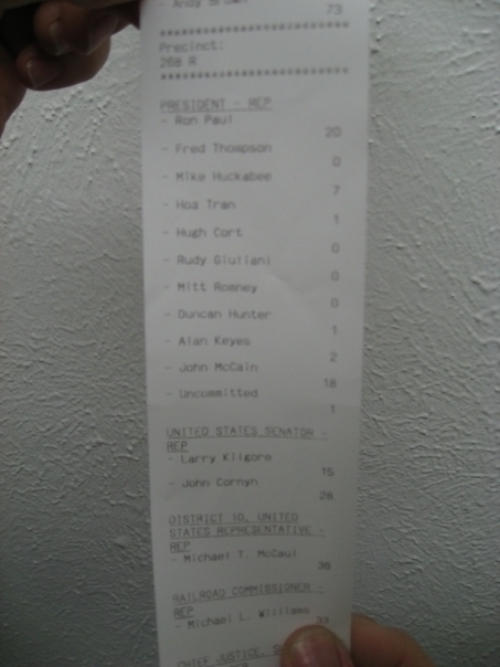 ![]() March 4th, 2008 Texas Primary Austin, TX As involved as I have been in our presidential race over the past year now, March 4th (the Texas primary) was finally my day to vote. Although I believe that Texas is significantly better than a lot of other states since we have an open primary system here, I believe that our system is just terrible. Absolutely and positively terrible. The reality is that I wanted to cast a vote for Ron Paul, but none of the other Republicans on the sheet. However, since I wanted to Vote for Ron Paul, I was only allowed to choose from the other Republican candidates as well. Consequently, and with exception of Don Zimmerman (who organized the bulk of Ron Paul support in Austin), I abstained from casting a vote in any other positions. In this album: Don Zimmerman, Michael Ludlow, Ron Paul |