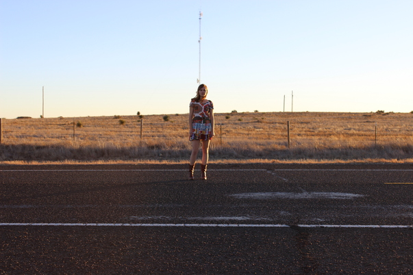A woman in a colorful dress poses for a picture in the middle of the road, a grassy field in the background. |