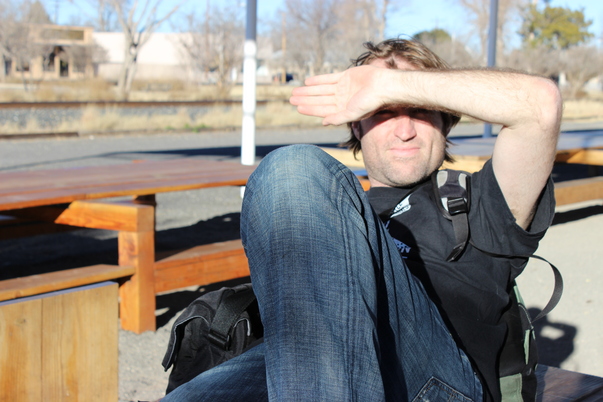 A man enjoying a beautiful day covering his eyes from the bright sun. |