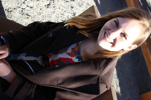 A teenage girl with red hair and an over-sized brown coat is smiling while sitting on a bench. |