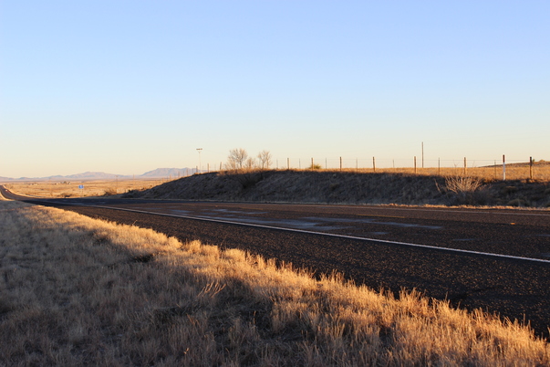 A deserted two lane road down the middle of a barren area on a sunny day, |