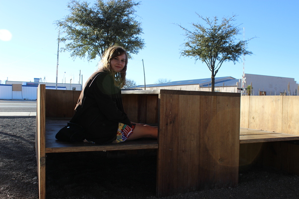 There is a girl in a black jacket sitting outside on a sunny day. |