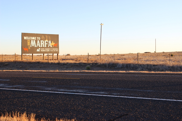 There is a treeless expanse of scrub land, a blue sky, and an empty road with a billboard reading, "Welcome to Marfa" beside it. |