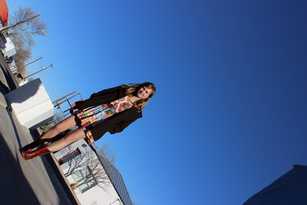 A girl with long shiny hair who wears a black blazer, printed dress and red cowboy boots is posing on the street. |