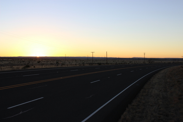 A freshly paved road in a flat, grassy landscape in the early morning. |