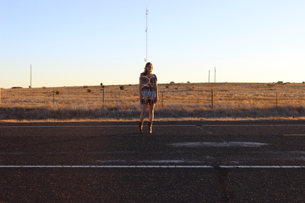 There is a woman in a dress and boots standing in the middle of a paved road. |