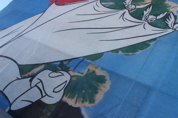 An artist's rendering of three little birds clinging by their beaks to a piece of cloth while hovering above a scared worm. |