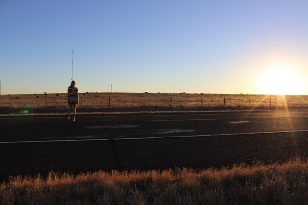 A woman in a colorful dress poses for a picture in the middle of a road, with the sun setting behind a grassy field behind her. |