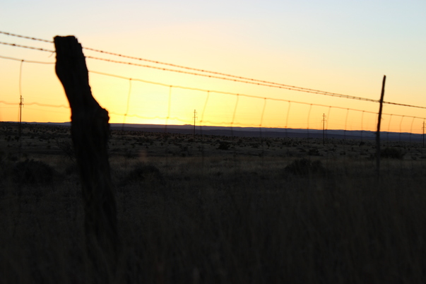 There is a wire fence on an open, treeless prairie, with a vivid yellow sunset behind it. |