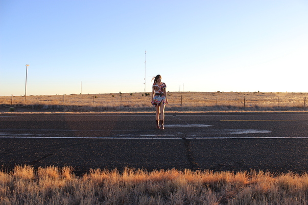 A young woman dressed in a flirty summer dress and cowboy boots crosses a lonely highway. |