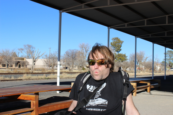 The young man sits at a picnic table wearing his sunglasses and his backpack. |