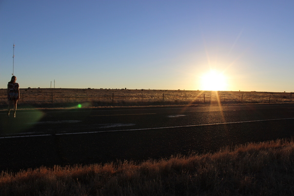 A girl walks along a deserted road with open fields, as the sun is either rising or setting. |