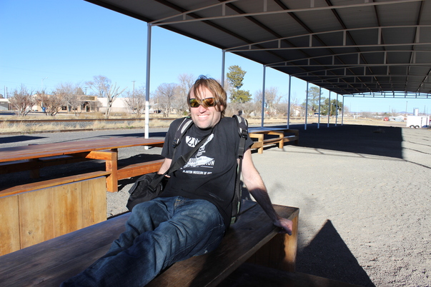 There is a man smiling and wearing sunglasses sitting on a table outside. |