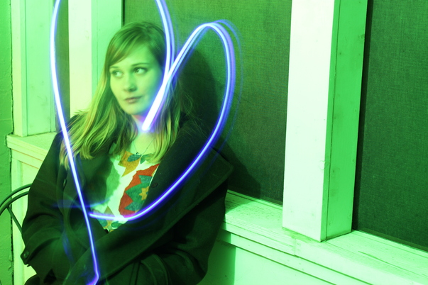 This girl is perfectly framed in a photo using a blue neon light, contrasted with an overly green-ish tint |