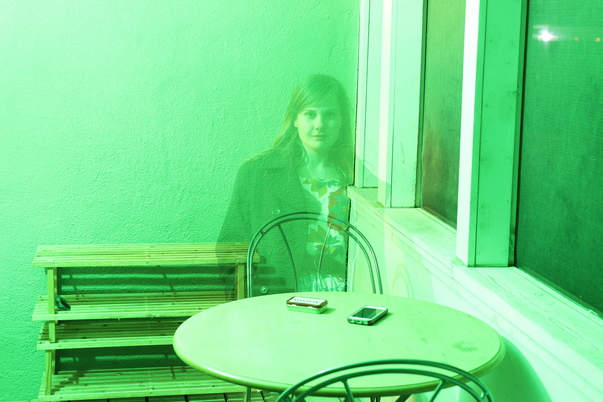 This room is green lighted and a table and two chair, two mobile phone on the table and in wall a shadow of a women |