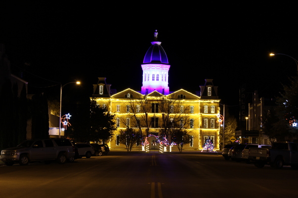 A very well lit building with a dome at the head of a street is decorated for the holiday season. |