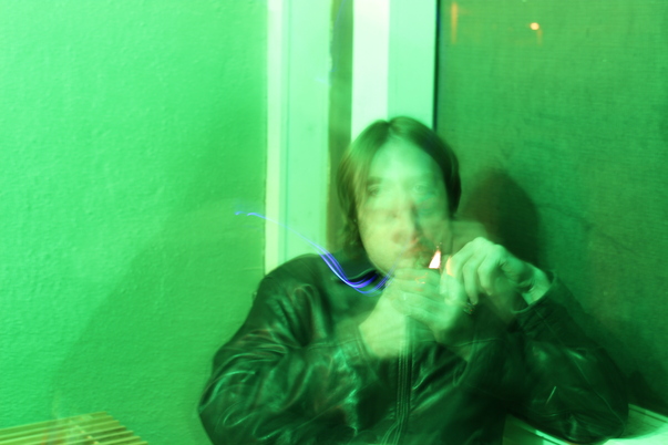 There is a man that is lighting up a cigarette in his hand and the room is a tinted green color |