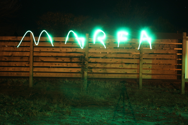 A wooden fence is shown holding up a set of neon letters that spell out MARFA. |