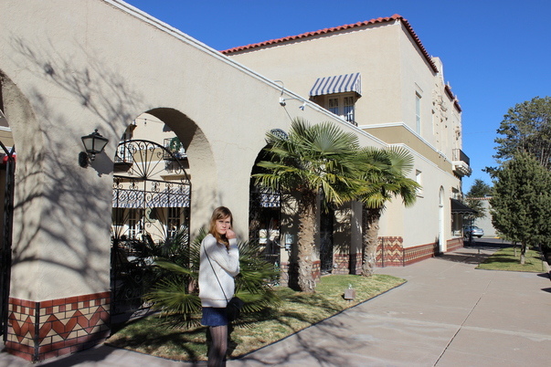 Interesting backdrop of a home that appears to be near the water with great weather. A young lady poses in a skirt and sweater looking from a far. |