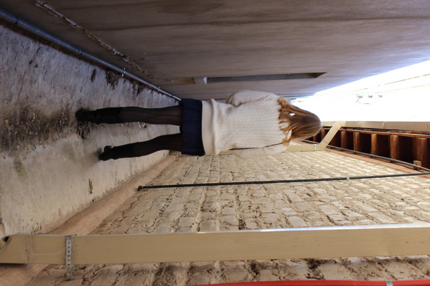 A woman in a white sweater poses in a narrow alleyway with her back to the camera. |