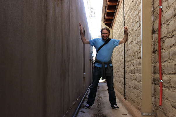There is a smiling man wearing a blue shirt standing in between two walls in an alley way. |