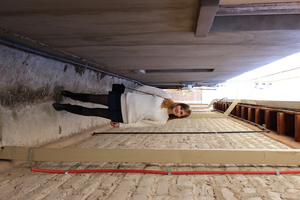 A woman in her 20s stands in a narrow alley between two buildings. |