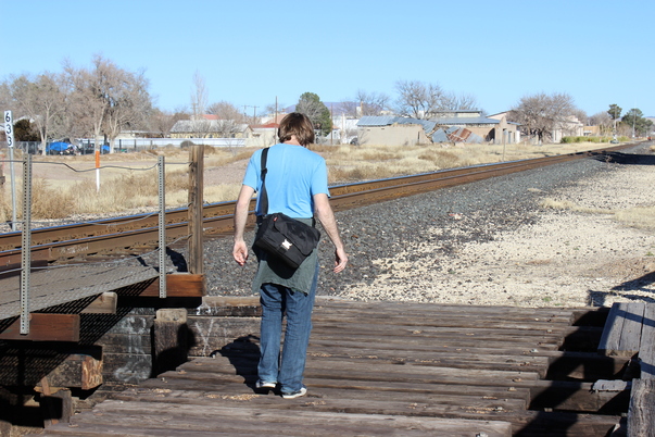 There is a person with a black cross bag that is standing on the tracks or near the train tracks |