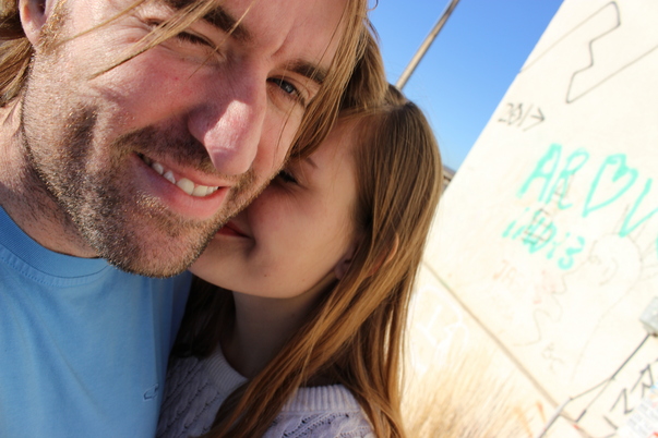 There is a man that is holding his little girl in his arms they both have brown hair |