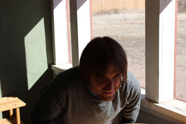 A man with hair hanging in front of his eyes stands next to a sunlit window. |