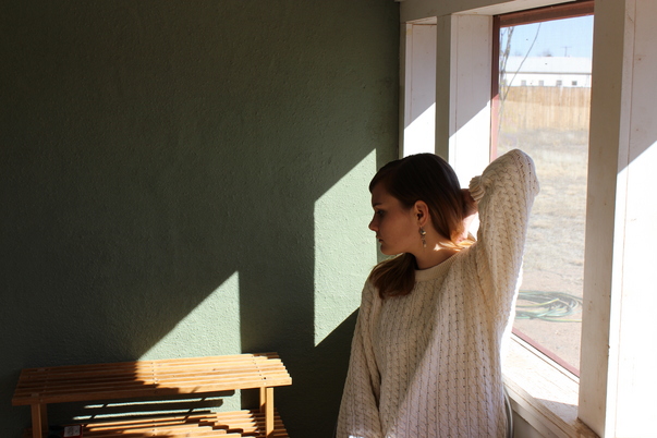 Bright sunlight comes through a large window, illuminating the background behind a girl wearing a white wool sweater and drop earrings. |