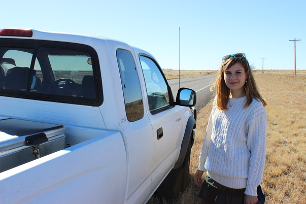 There is a woman wearing a white sweater standing next to a white truck by the side of the road. |