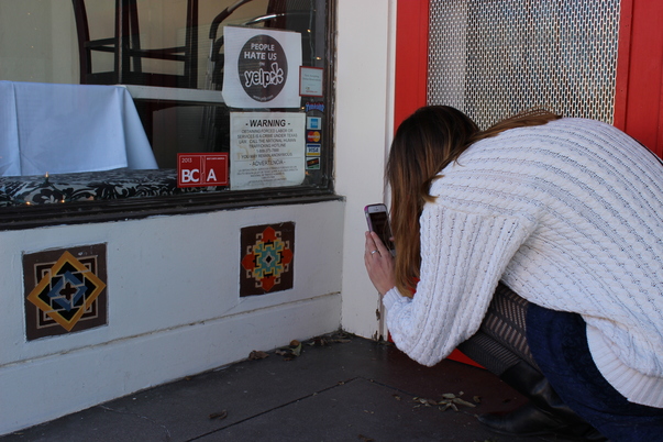 A woman in a white sweater crouching down next to a building and looking at her phone. |
