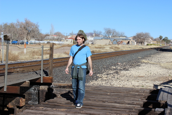 A man in a blue t-shirt and blue jeans standing near railroad tracks. |